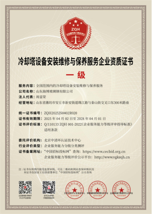 冷却塔设备安装维修与保养服务企业资质证书